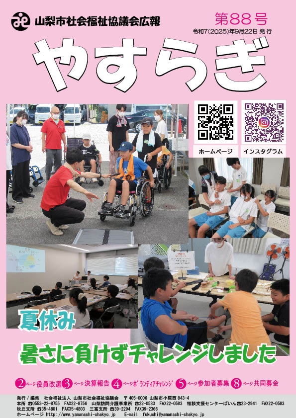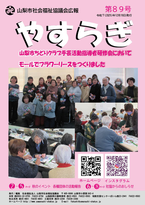 山梨市社会福祉協議会では、年会4回(5月、9月、12月、2月)の広報紙「やすらぎ」を発行しています。